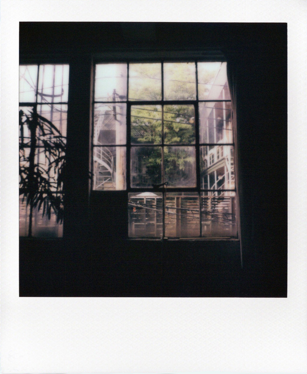 This is one of my favourite Polaroid images that I’ve taken so far. I took it near the end of my month long stay in Montréal, working from a studio at OBORO gallery. There was a lot of wildfire smoke that had blown into the city that day, so I was mostly staying indoors, working at the tables that I set up to face the back alley windows. At one point I looked up and was drawn to the green of the tree across the alley, framed by the window’s grid, so I picked up the camera and took this photograph.